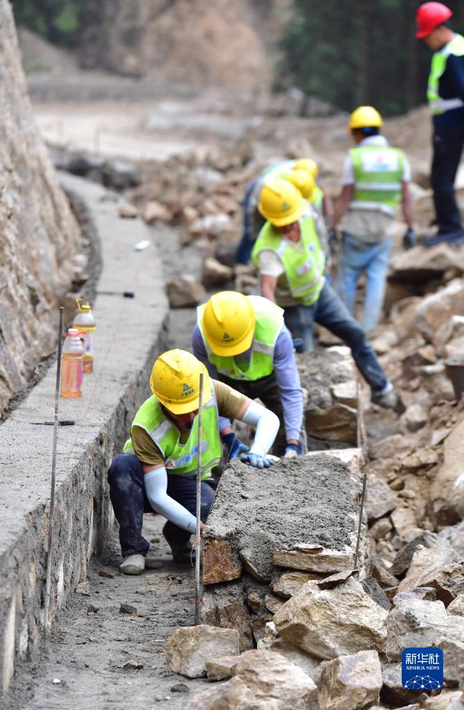 在融水苗族自治县杆洞乡花孖村,工人在公路建设现场施工(5月11日摄)。