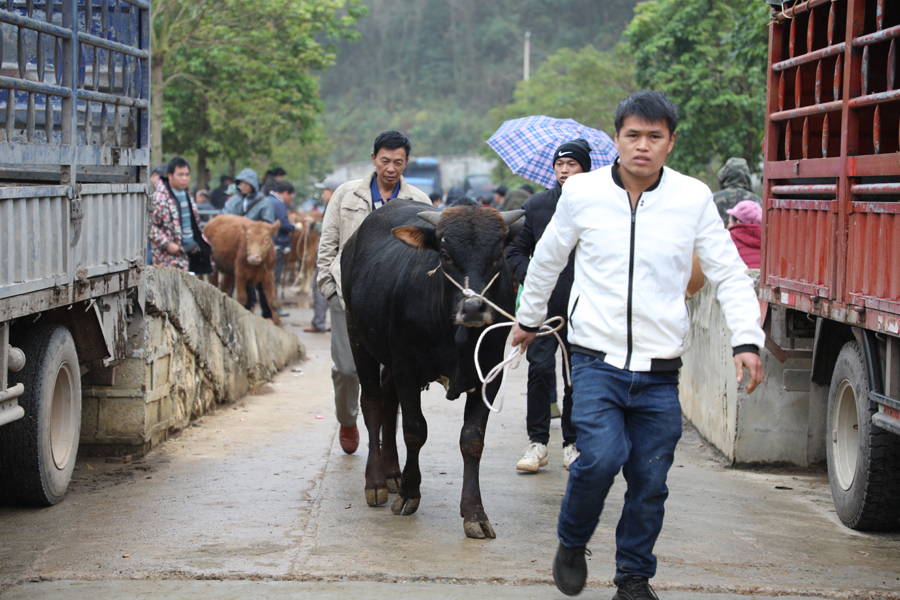 7时,在市场里,来自云南、贵州、广东、湖南等地的1000多名客商和当地养殖户,就已经在毛毛细雨中忙碌起来。一头头水牛和黄牛有序排开,人们三五成群地聚在一起,讨价还价、牵牛装车、现金结算,热火朝天。