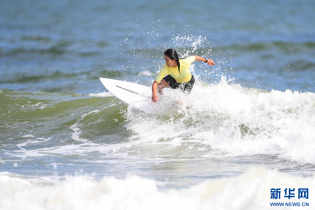 7月12日,南宁队选手邓雪莹获得第一届全国学生(青年)运动会冲浪项目女子短板冠军。新华社记者 曹祎铭 摄
