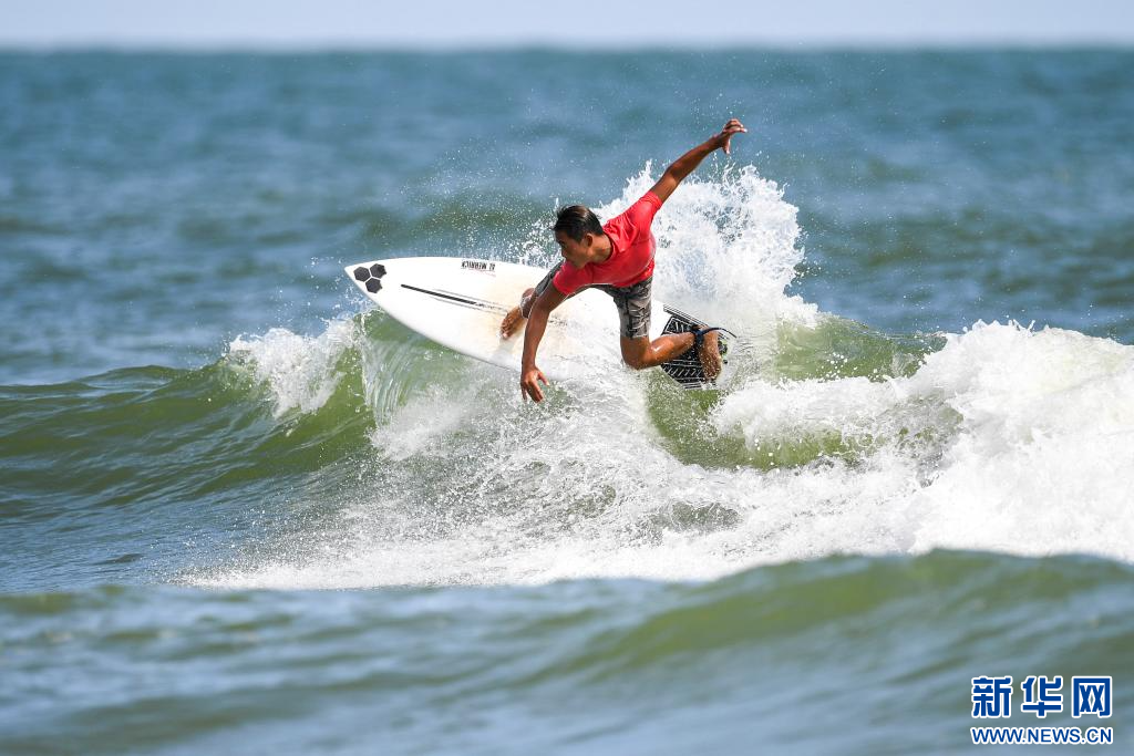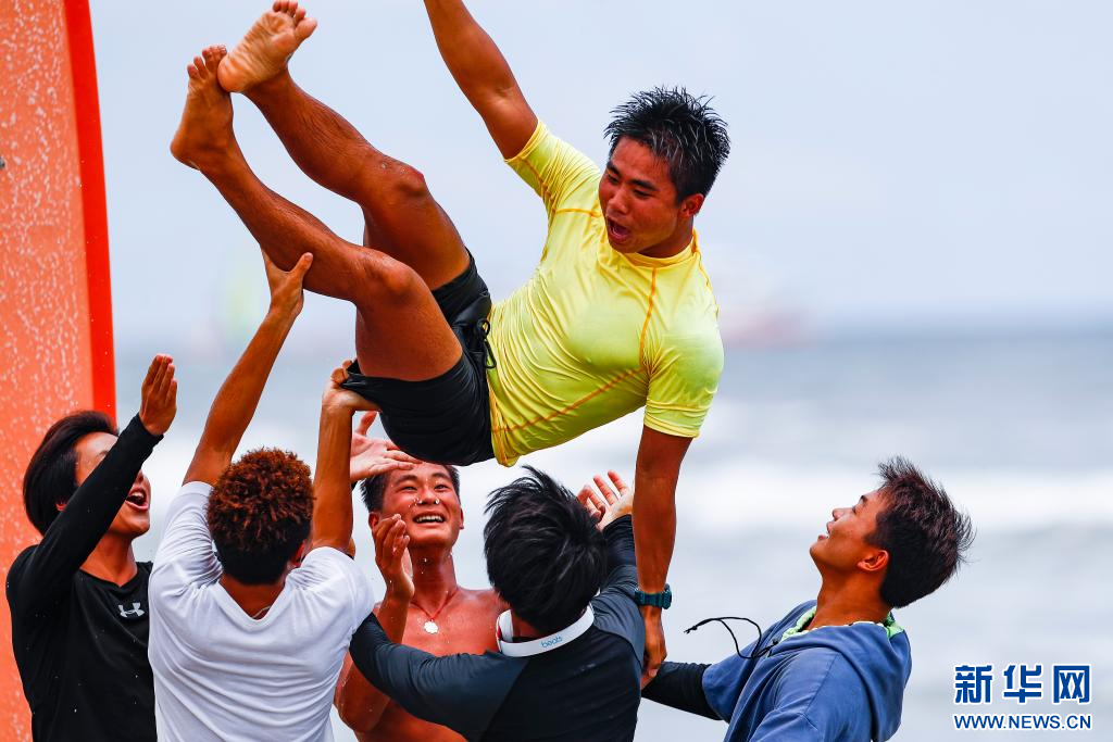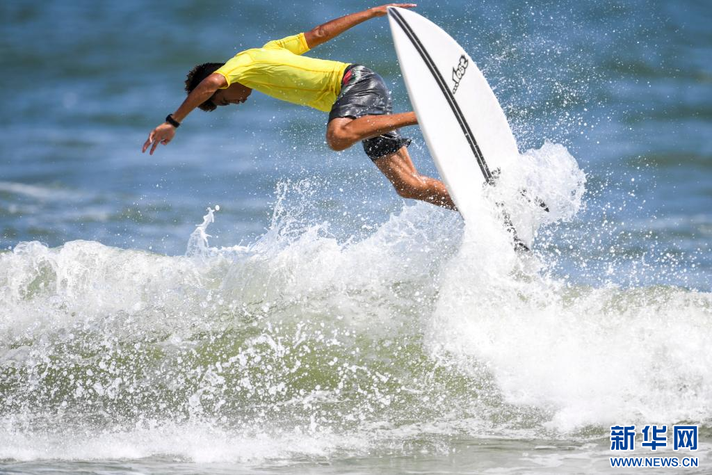 7月12日,海口队选手吴世栋获得第一届全国学生(青年)运动会冲浪项目男子短板冠军。新华社记者 曹祎铭 摄
