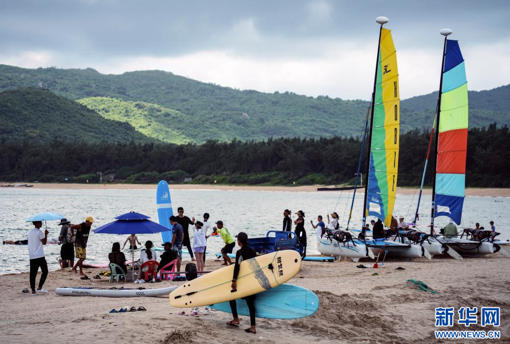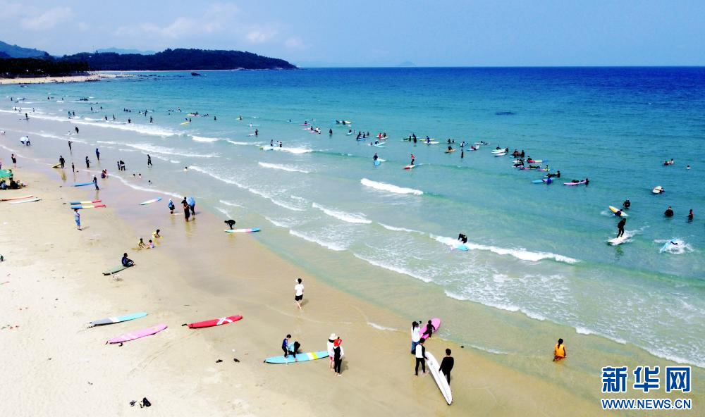 5月1日,游客在海南省万宁市日月湾国家冲浪基地冲浪、休闲(无人机照片)。新华社发(叶龙斌 摄)