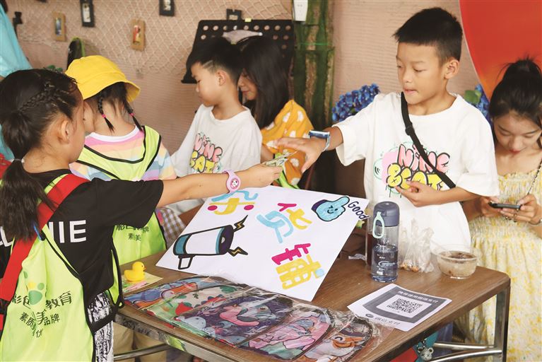 活动现场,30多名“小卖手”吆喝着售卖漫画作品、凉粉、米虫、凉粽、南瓜花、西红柿、豆腐酿等,忙得不亦乐乎。