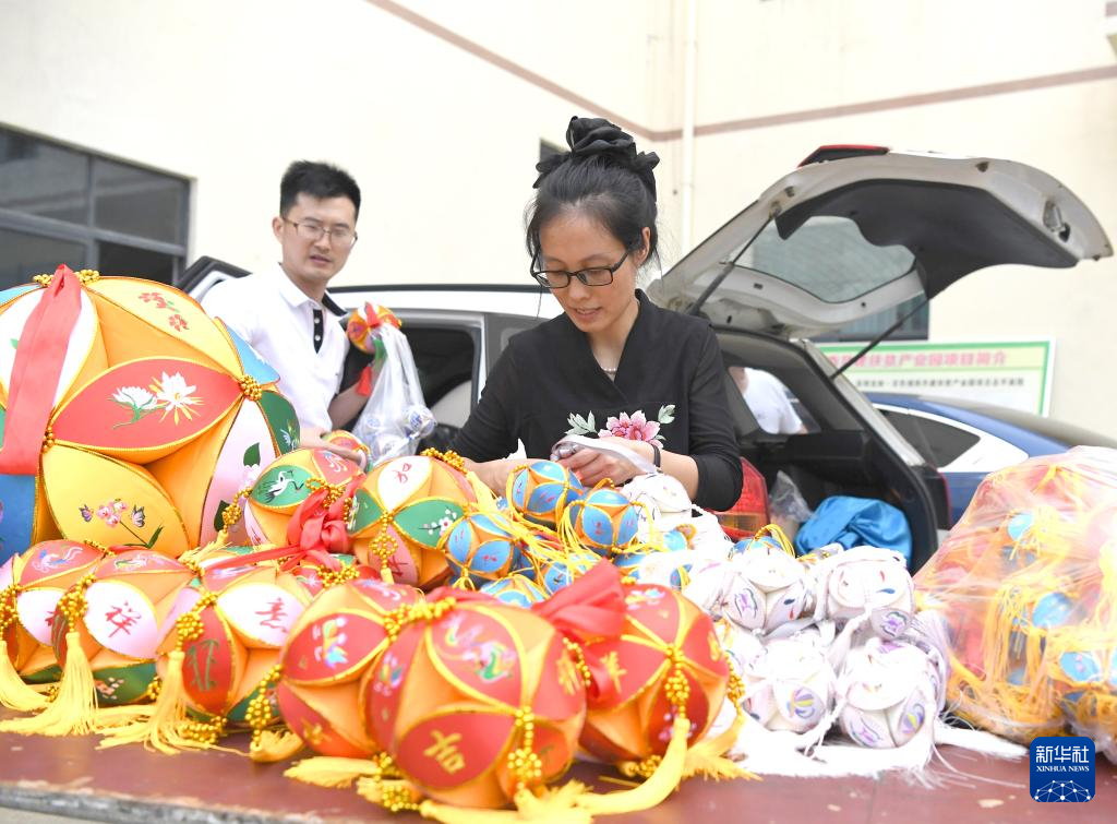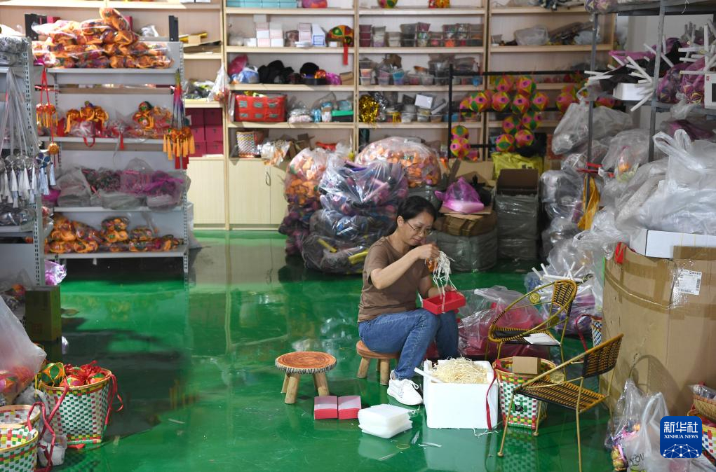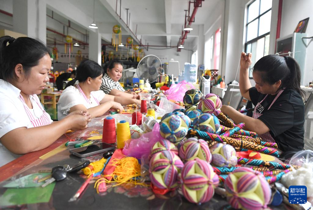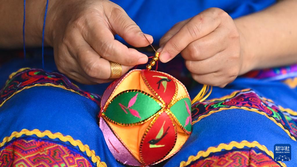↑在靖西市旧州村,一名绣娘在将绣球组合成型(8月2日摄)。