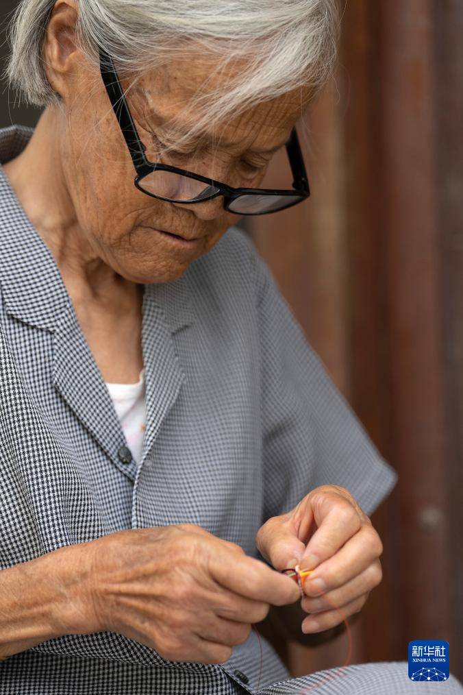 ↑8月2日,在靖西市旧州村,85岁的村民梁爱莲在制作绣球。