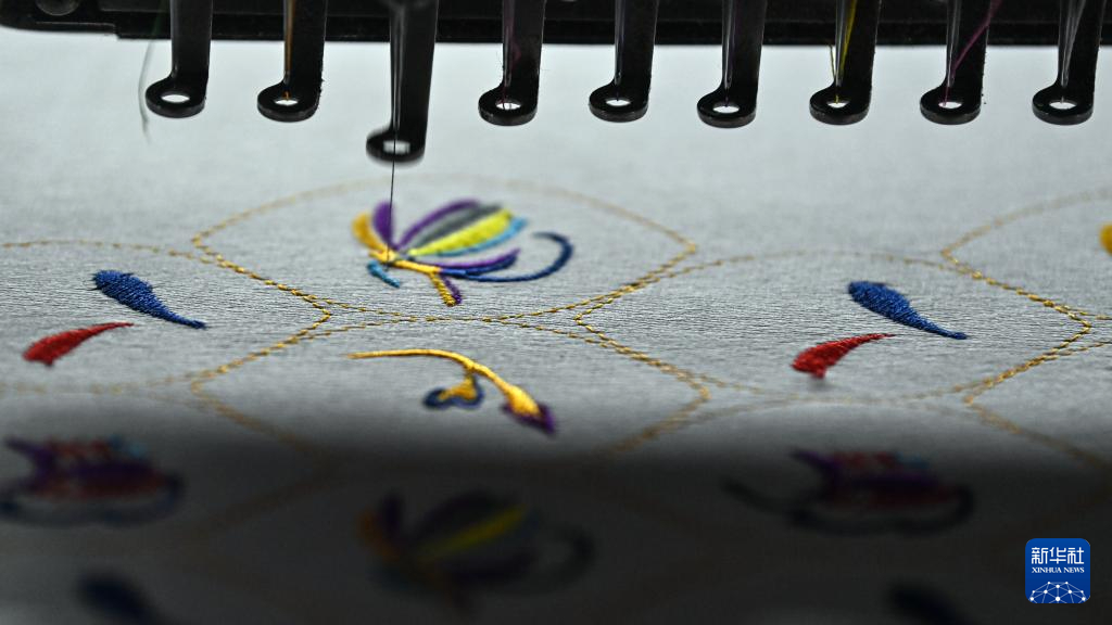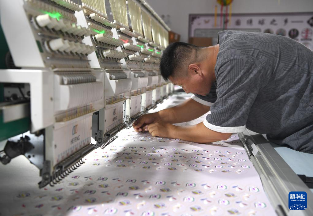 ↑在靖西市非遗传承人王秀芬绣球制作车间,机器在绣花(8月2日摄)。