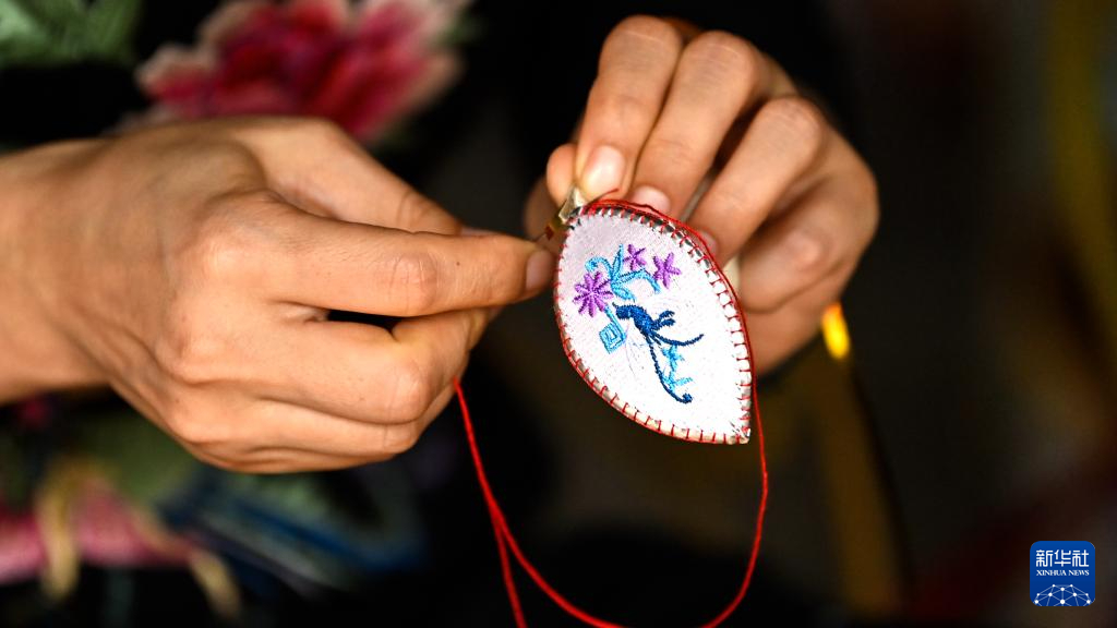 ↑在靖西市旧州村,一名绣娘在手工绣花(8月2日摄)。