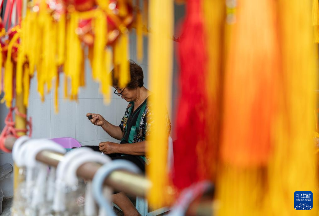 ↑8月2日,在靖西市旧州村,一名村民在制作绣球。