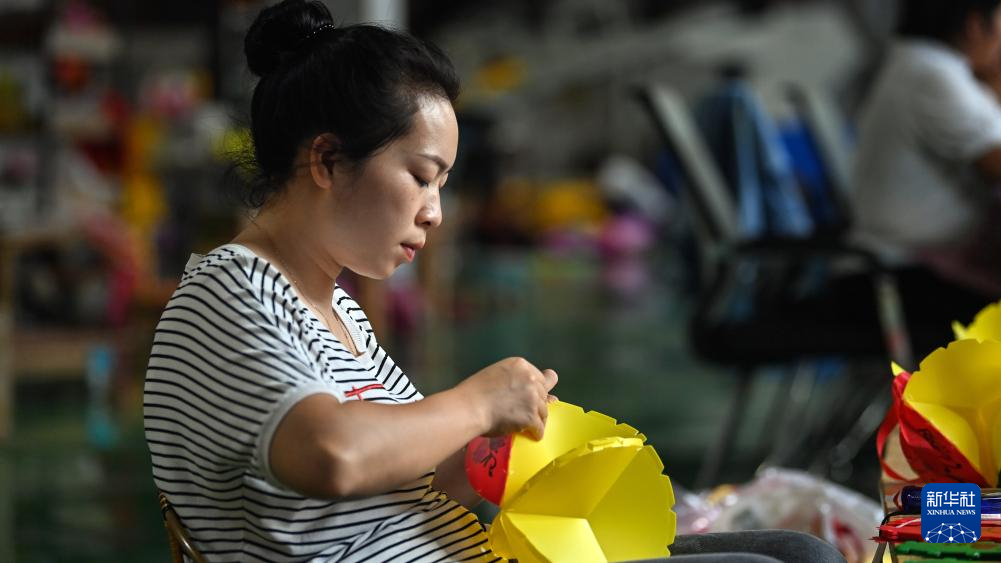 ↑工人在靖西市绣蕴坊绣球文化有限公司制作绣球灯(8月2日摄)。