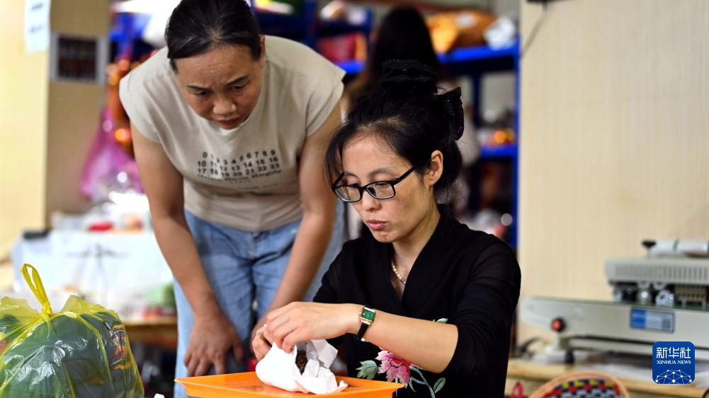↑在靖西市非遗传承人王秀芬绣球制作车间,王秀芬(右)在称取香料制作香囊(8月2日摄)。