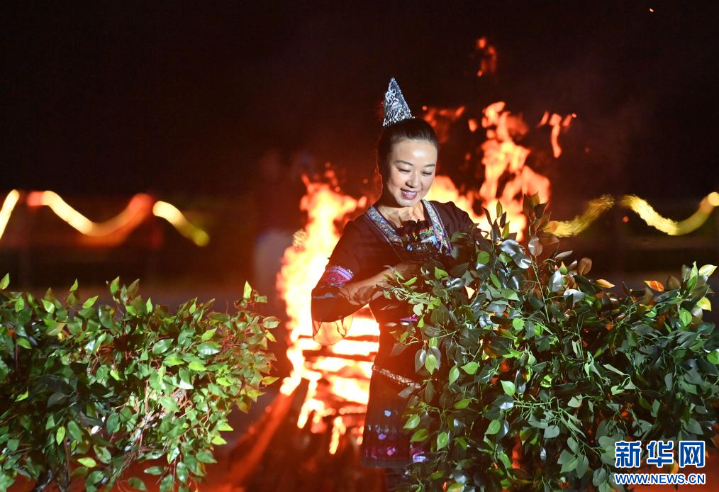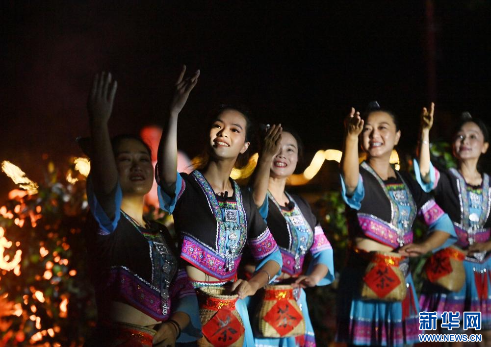 9月5日,在梧州市苍梧县六堡镇山坪村同心广场,各族干部群众在篝火晚会上跳“民族团结舞”。