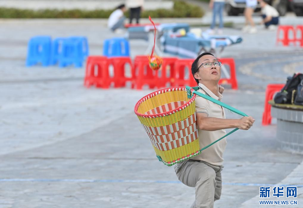 9月5日,在梧州市苍梧县六堡镇山坪村同心广场,选手们在抛绣球比赛中。
