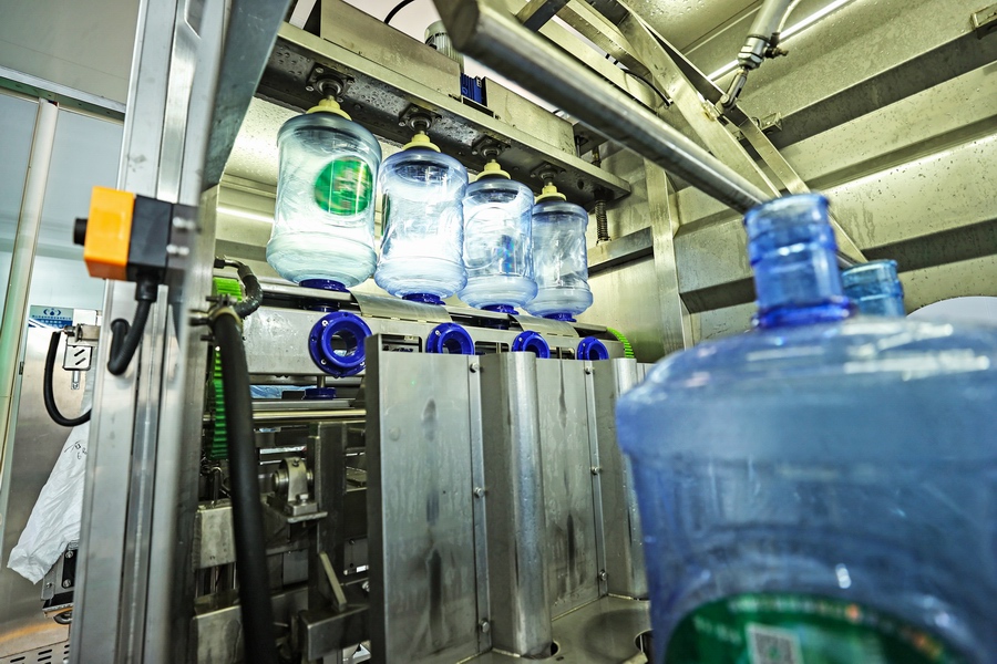 近日,在广西容县大水山泉饮用水有限公司车间,看到全自动矿泉水生产线的机器在高速运转,工人们分散在各自的工作区域内,有条不紊地进行清洗、灌装、喷码、贴标、包装、搬运等作业,经过一系列的工序,一瓶瓶(桶桶)矿泉水被源源不断发往市场。