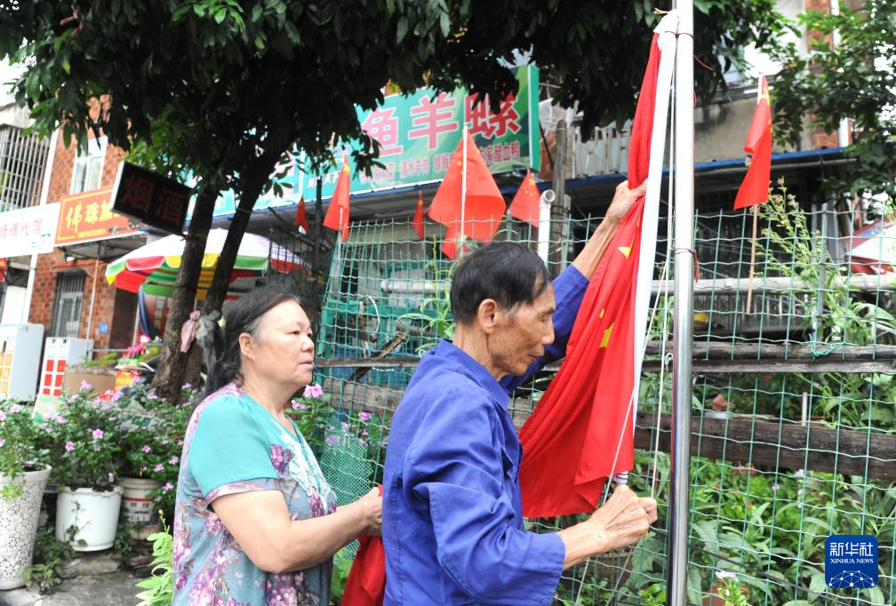 10月2日,梁乐(右)和爱人在自家门口升国旗。
