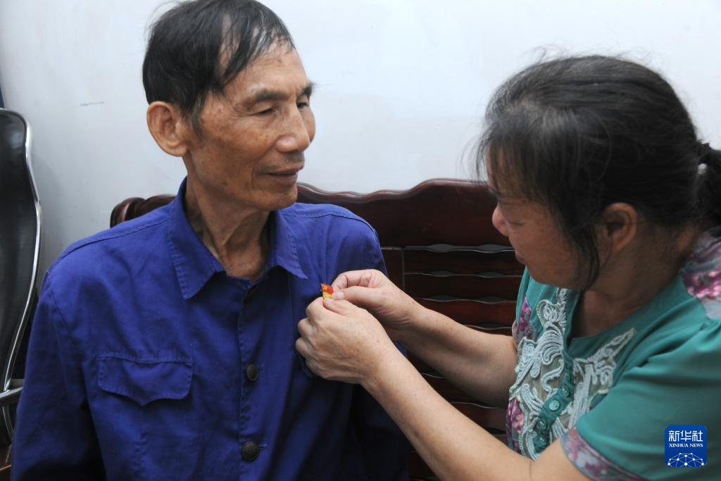 10月2日,梁乐在家中查看“在党50年徽章”。