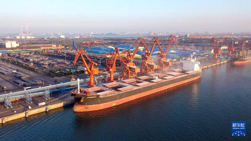海轮在广西防城港散货码头卸货(9月16日摄,无人机照片)。