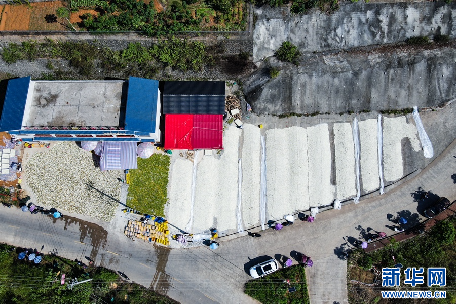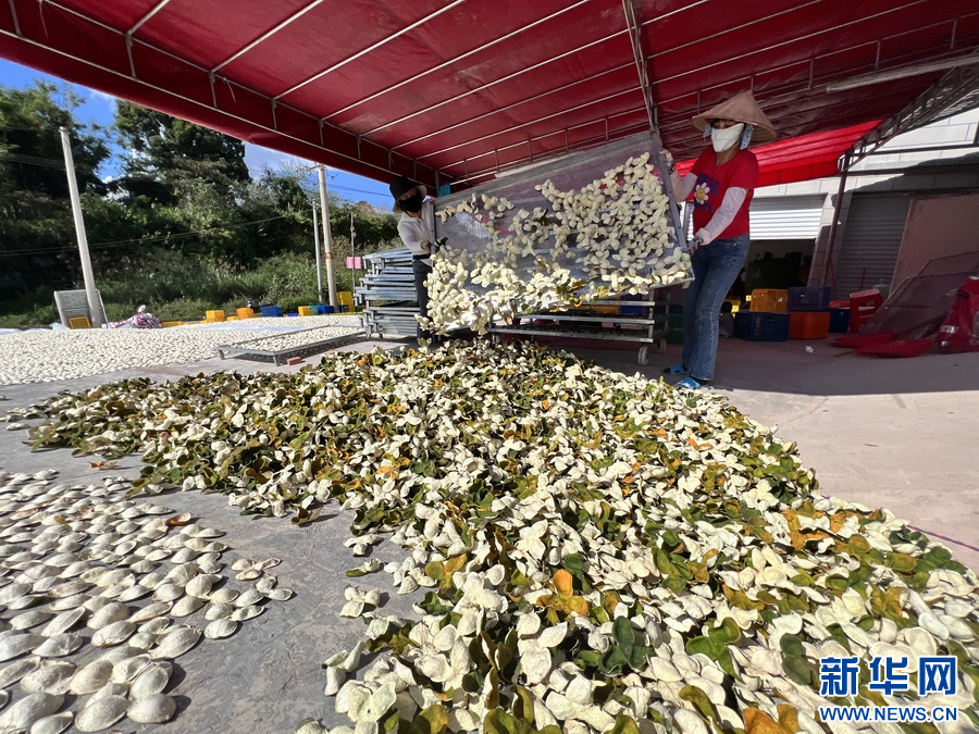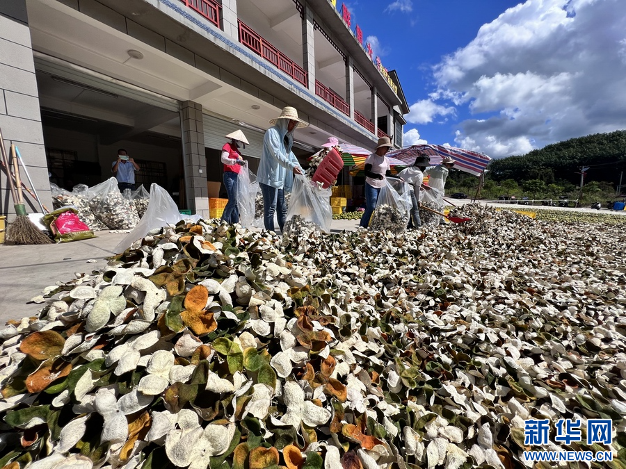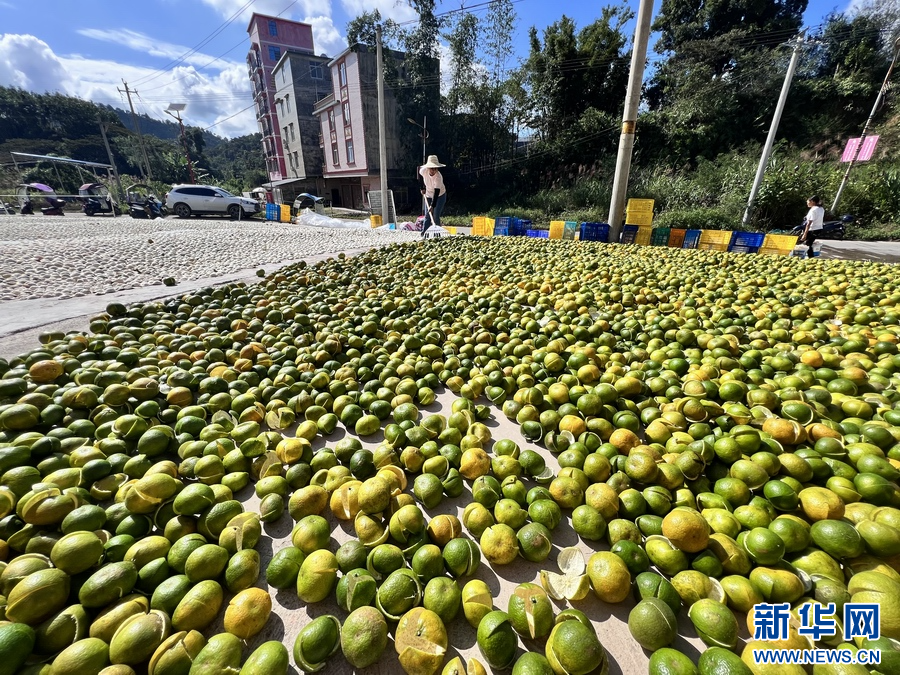 眼下正值柑果的丰收季,走进广西防城港市防城区那良镇四会柑果皮仓储交易中心,工人们正在给已清洗的柑果进行开果、翻皮、烘干、晾晒……晒场上,铺满的果皮在太阳下晒着“日光浴”,空气中弥漫着柑果的清香和陈皮的浓香。