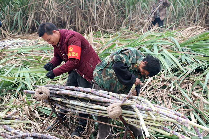 党员和村民一起捆绑甘蔗。唐秋玲 摄