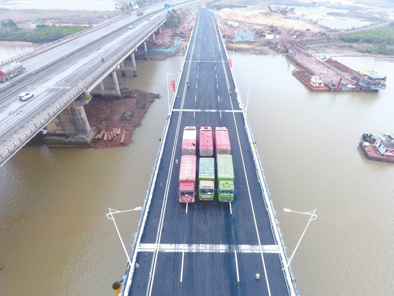 1月18日,平陆运河沿线跨线桥——沙井钦江大桥保通桥实现通车试运行,这是平陆运河沿线首座实现通车试运行的桥梁。