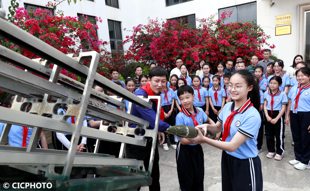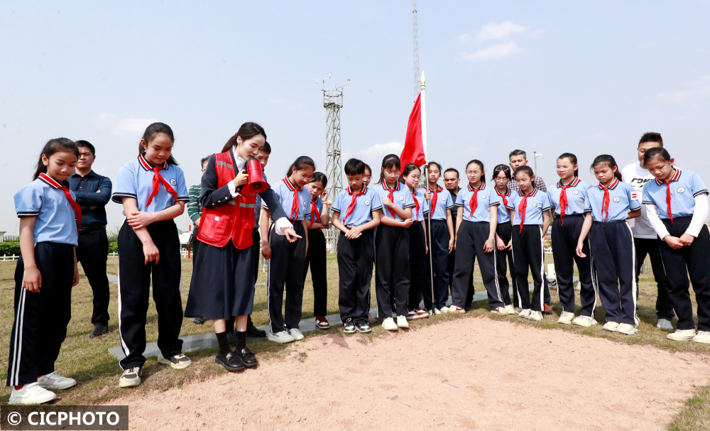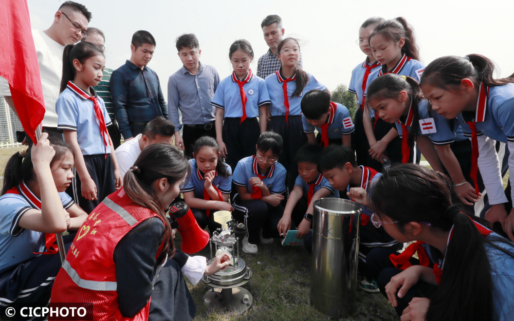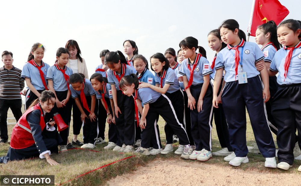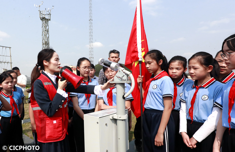 以上照片:2024年3月21日,广西崇左市扶绥县气象局气象观测场,工作人员向学生讲解气象知识。CICPHOTO/卢文斐 摄