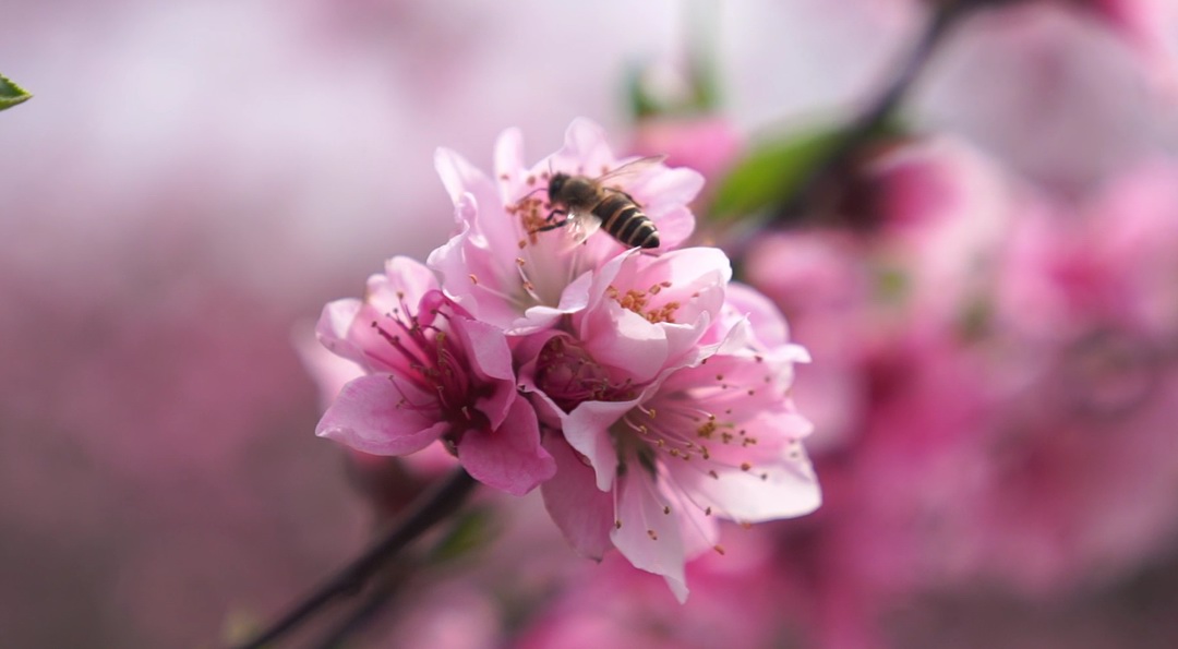 桃花争奇斗艳盛开,吸引蜜蜂穿梭花间授粉。