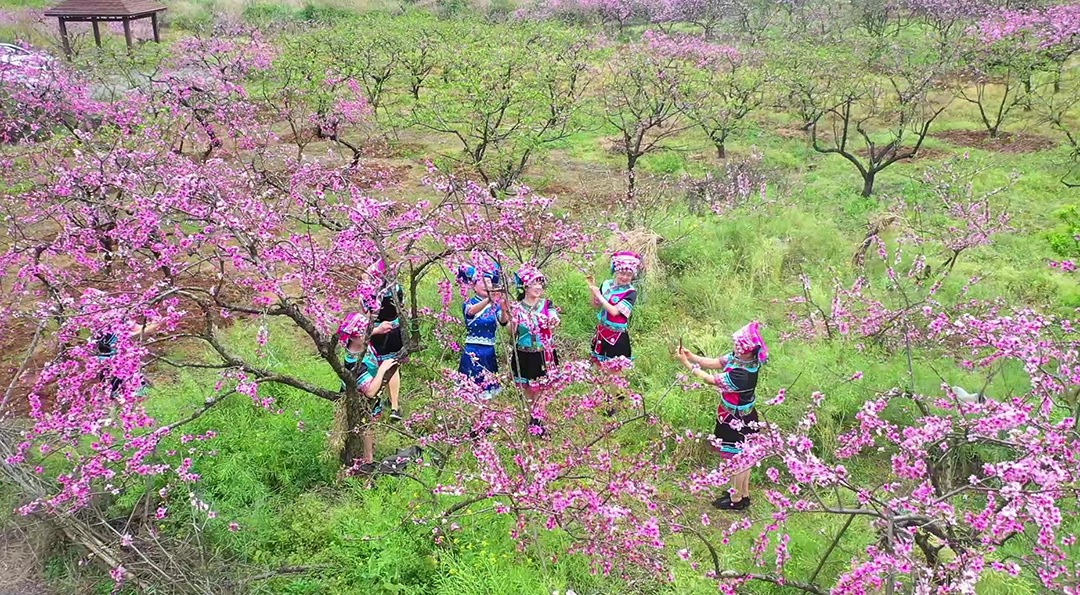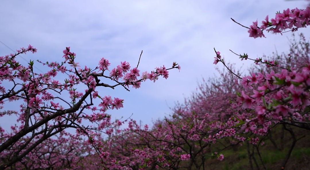 远远望去,绿树、村庄和漫山桃花宛如一幅动态的春日画卷。在桃花交织的袅袅绯烟中,游客们携朋唤友用镜头记录下这令无数人心驰神往的春日限定。