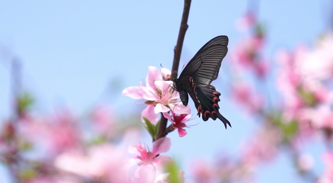 蝴蝶流连忘返于盛开的桃花里。