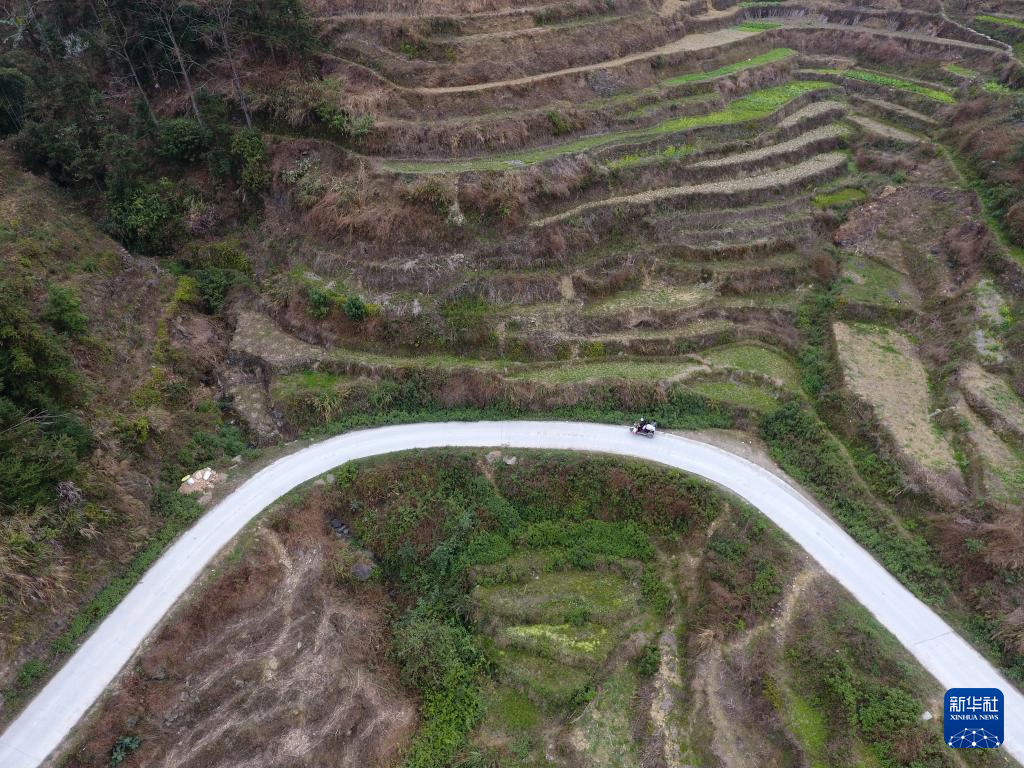 ↑在广西东兰县隘洞镇板康村,黄乜鲜用三轮车载着儿子黄必华行驶在上学的路上(2018年2月26日摄)。