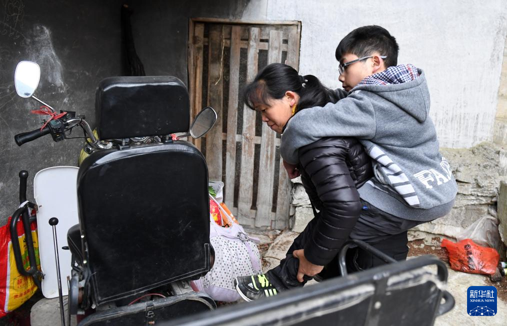 ↑在广西东兰县隘洞镇板康村,黄乜鲜背着儿子黄必华上三轮车(2018年2月26日摄)。