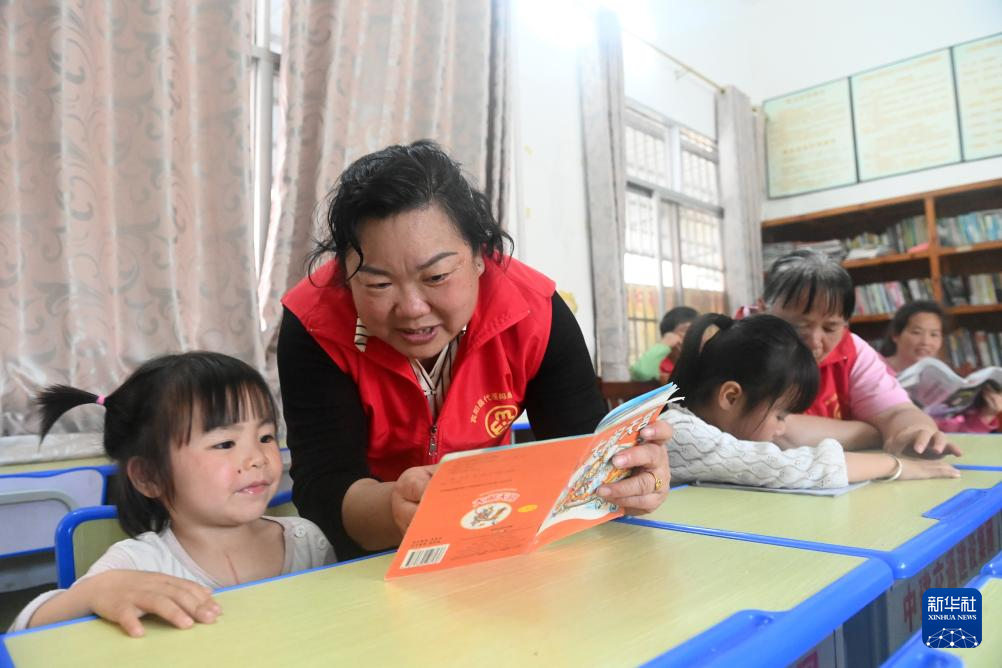 ↑在广西宾阳县中华镇的一个“留守儿童之家”,张清秀(左二)陪小朋友阅读(2024年3月5日摄)。