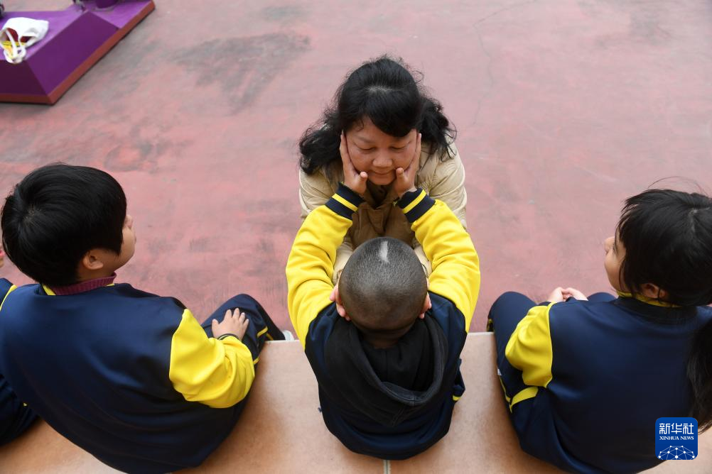 ↑在广西南宁高新区龙华学校,何冬艳和她照顾的学生在一起(2023年3月31日摄)。