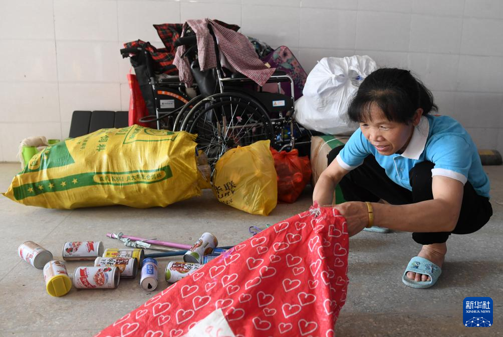 ↑在广西东兰县高级中学,黄乜鲜在收拾捡回来的废旧物品(2020年5月9日摄)。
