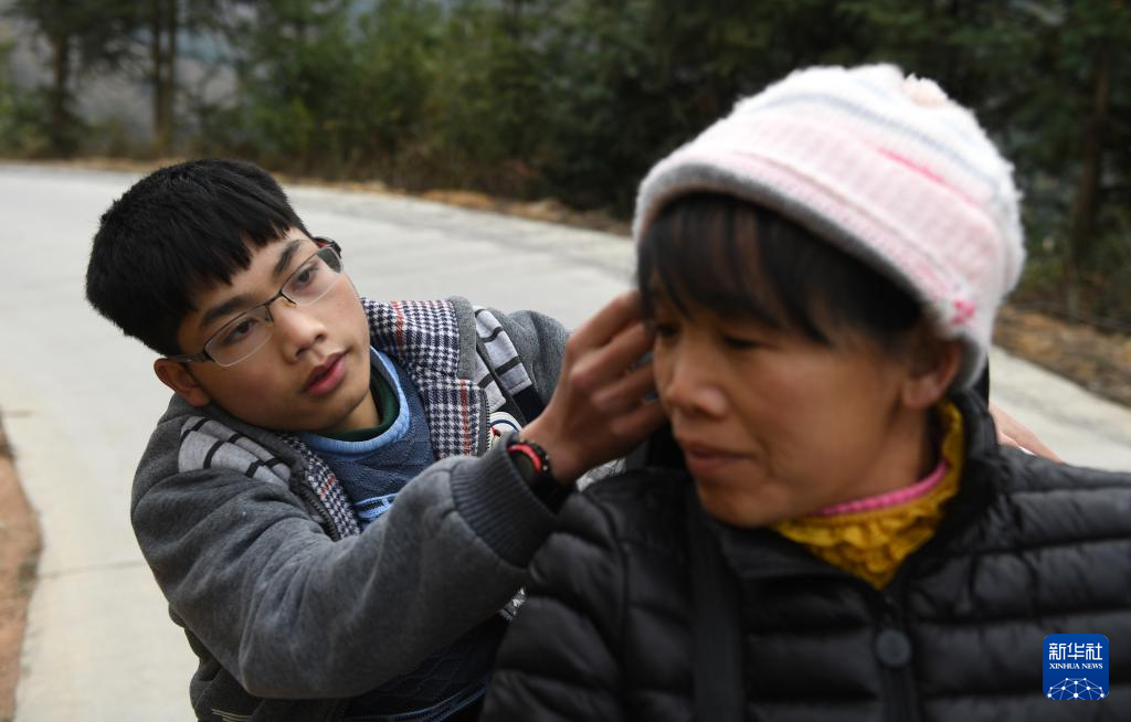 ↑黄必华在上学路上为妈妈黄乜鲜整理帽子挡风(2018年2月26日摄)。