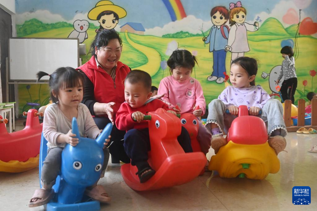 ↑在广西宾阳县中华镇的一个“留守儿童之家”,张清秀和孩子们一起玩耍(2024年3月5日摄)。