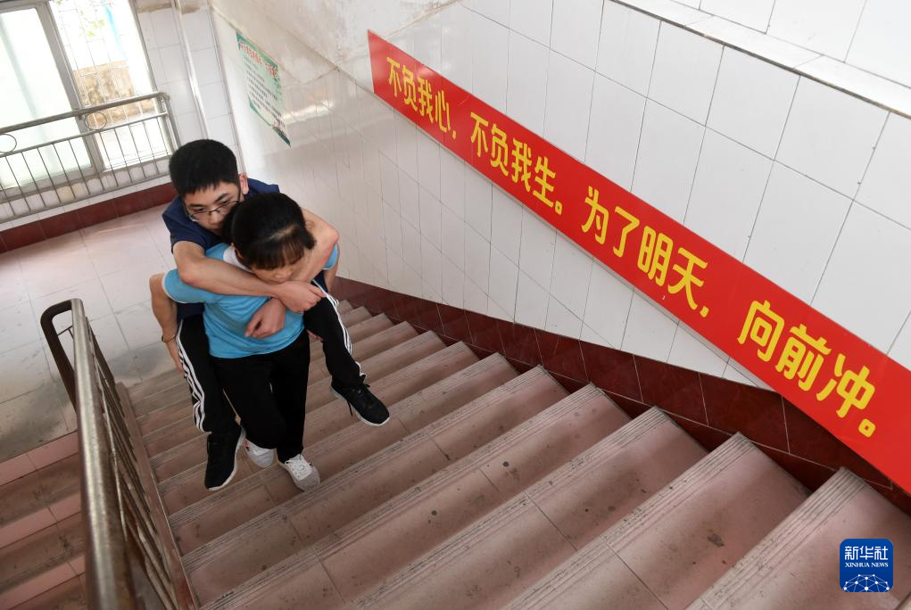 ↑在广西东兰县高级中学,黄乜鲜背着儿子黄必华前往6楼的教室(2020年5月9日摄)。