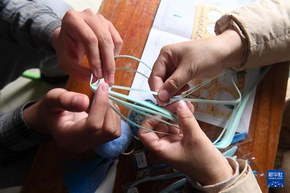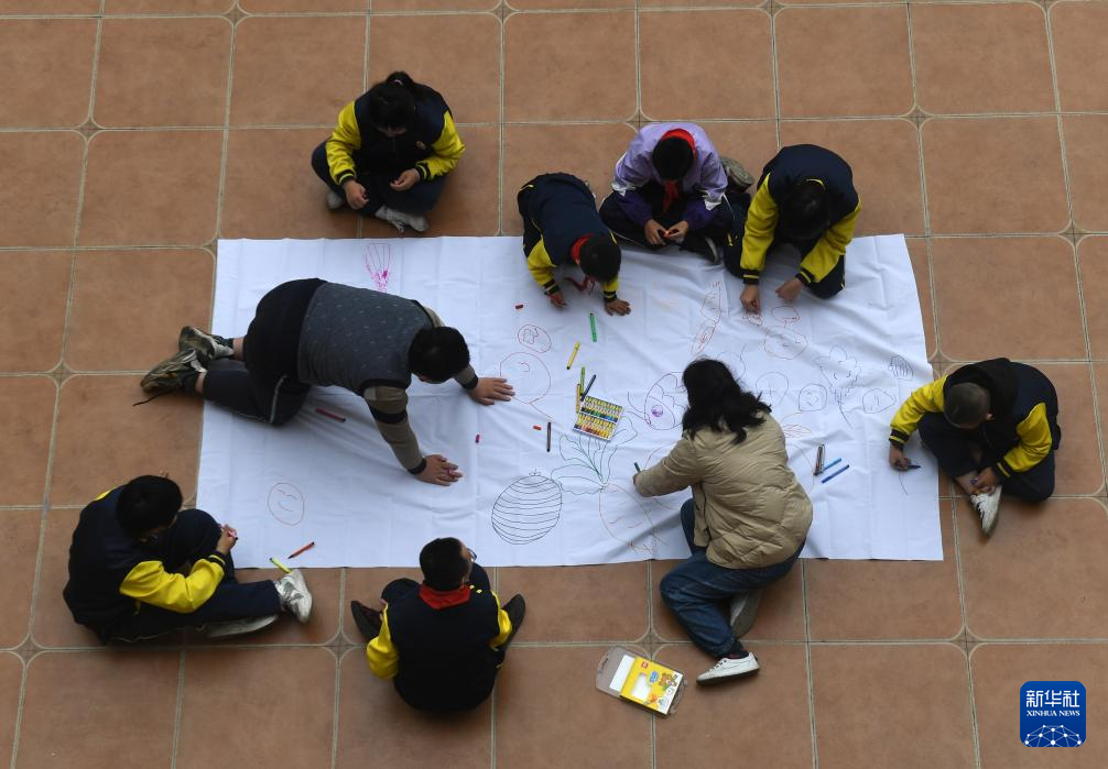 ↑在广西南宁高新区龙华学校,何冬艳教她照顾的学生画画(2023年3月31日摄)。