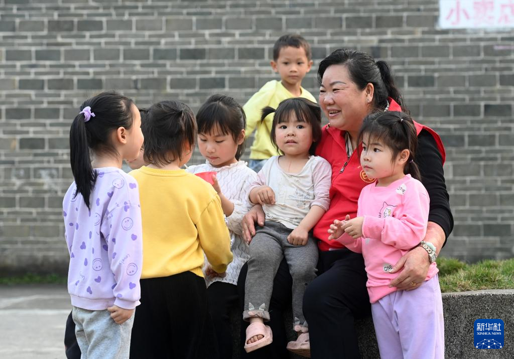 ↑在广西宾阳县中华镇的一个“留守儿童之家”活动室外,张清秀和孩子们交流(2024年3月5日摄)。