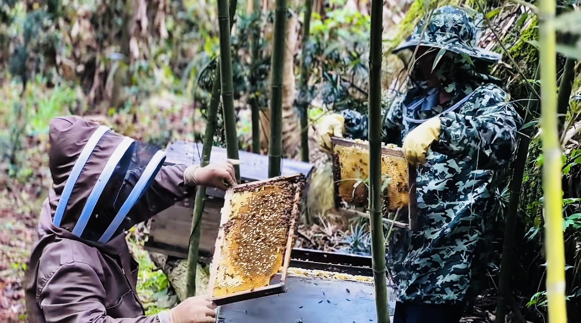 农户在树林中采收蜂蜜(伍绍龙 摄)
