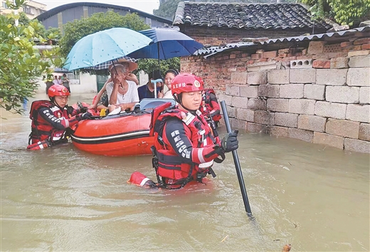 受强降雨影响,6月13日,桂林市城区多处发生内涝。当日上午,临桂区金水路一居民点有20人被困,当地消防救援人员利用橡皮艇进行分批转移。