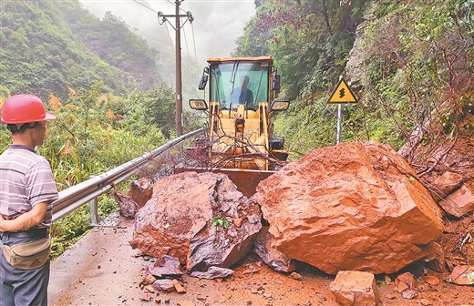 6月13日,灌阳县遭遇强降雨袭击,造成灌阳镇大源村一处道路塌方,村干部立即组织机械进行清障工作,尽快恢复交通。