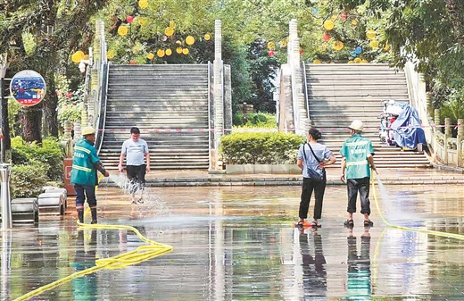 6月20日下午,桂林市区洪水逐渐退去,在正阳路、古南门一带,工作人员和市民在冲洗路面,尽快恢复正常生产生活。陈 静/摄
