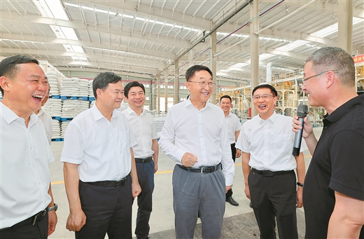 六月二十九日至三十日,自治区党委书记刘宁在贺州市调研。这是刘宁来到广西长鸿生物材料有限公司,实地考察生物降解母粒产业园建设、加快碳酸钙产业转型升级情况。 记者 黄 克/摄