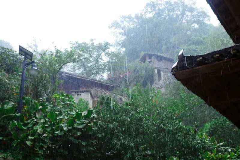 这是雨中的张家寨,传统房屋建筑隐没在绿树中。新华社记者 李欢 摄