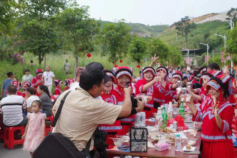 在广西隆林各族自治县举办的“长桌宴”活动中,身着少数民族服饰的游客正在合影留念。新华社记者 李欢 摄