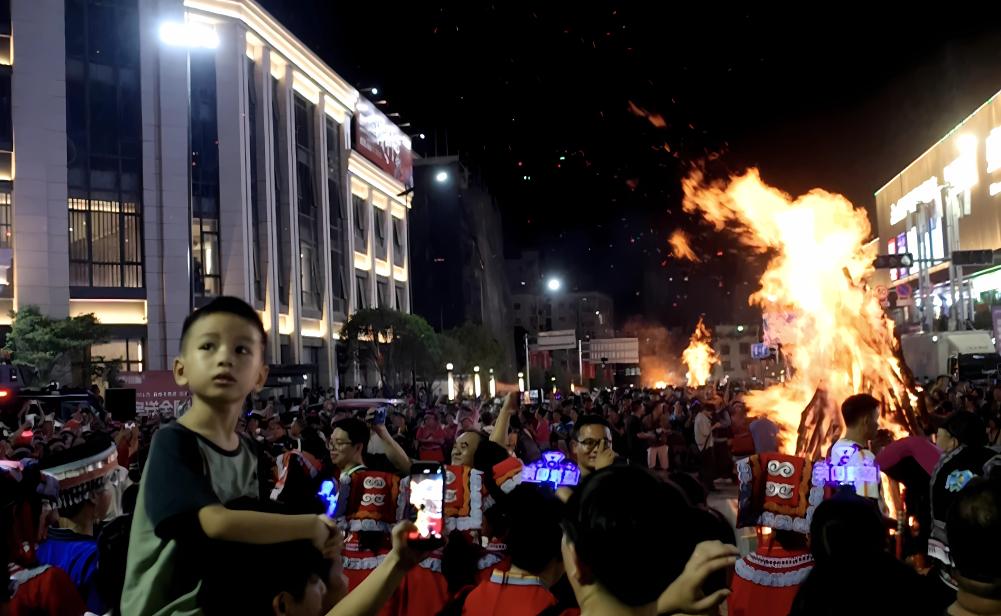 燃起熊熊篝火,火花绽放在夏夜,身着多彩服饰的少数民族群众与游客手拉手跳起舞。近日,在广西百色市隆林各族自治县举办的火把节活动上,火光映照着每一张洋溢着笑容的脸庞。从乡镇到村寨,从山顶到河边,隆林成了歌舞的海洋,欢歌笑语随着裙摆、火苗迎风飘荡。