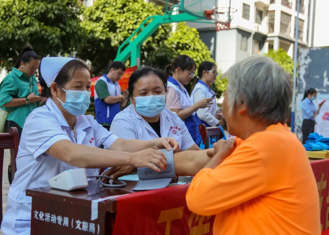 医护人员免费为社区老年人提供血压测量。零银卿 摄