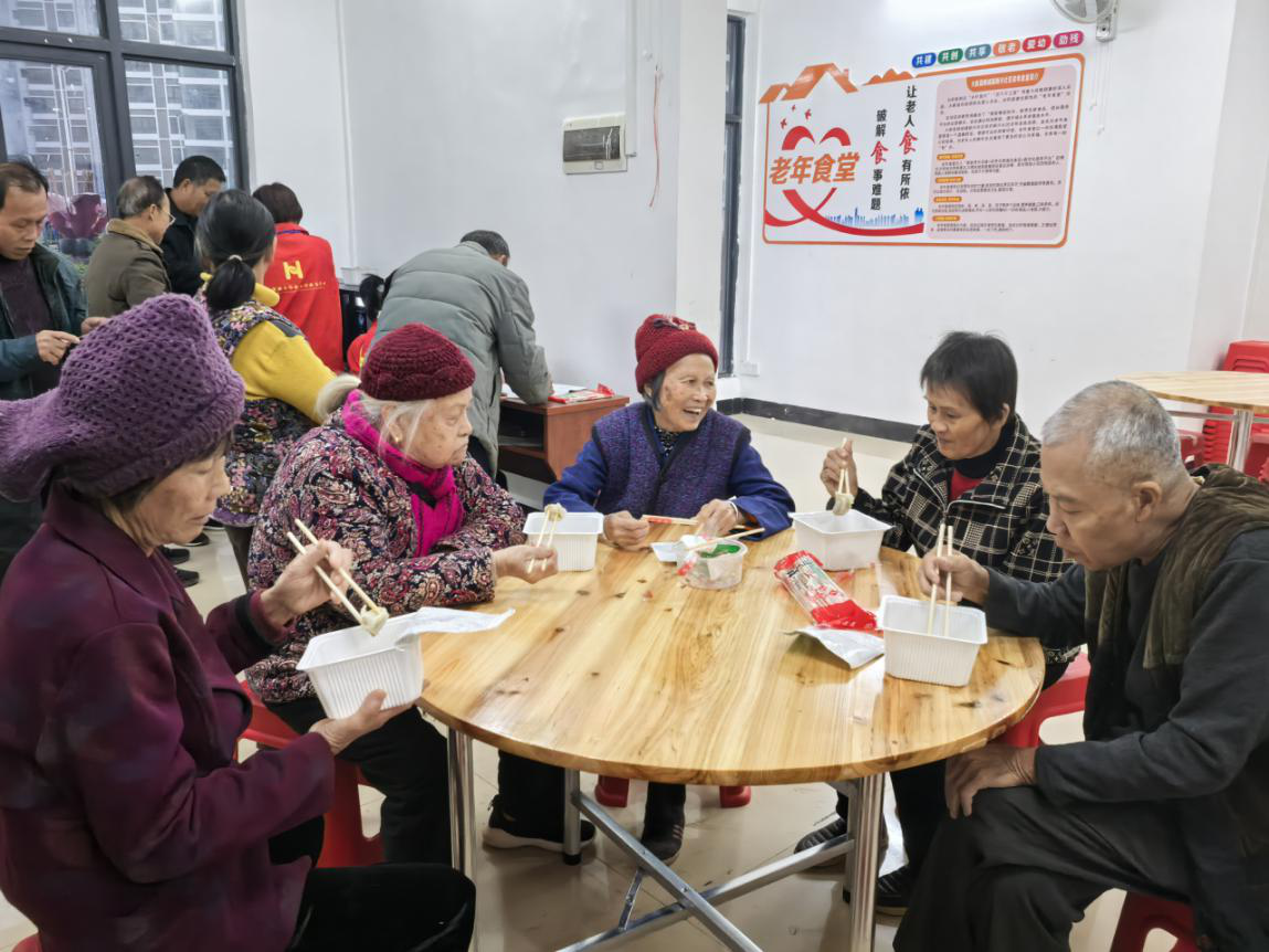 图为老年人在老年食堂享用晚餐。