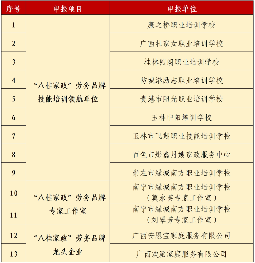经认定的13个自治区“八桂系列”劳务品牌技能培训领航单位、专家工作室和龙头企业,人社部门将按规定给予奖补扶持。