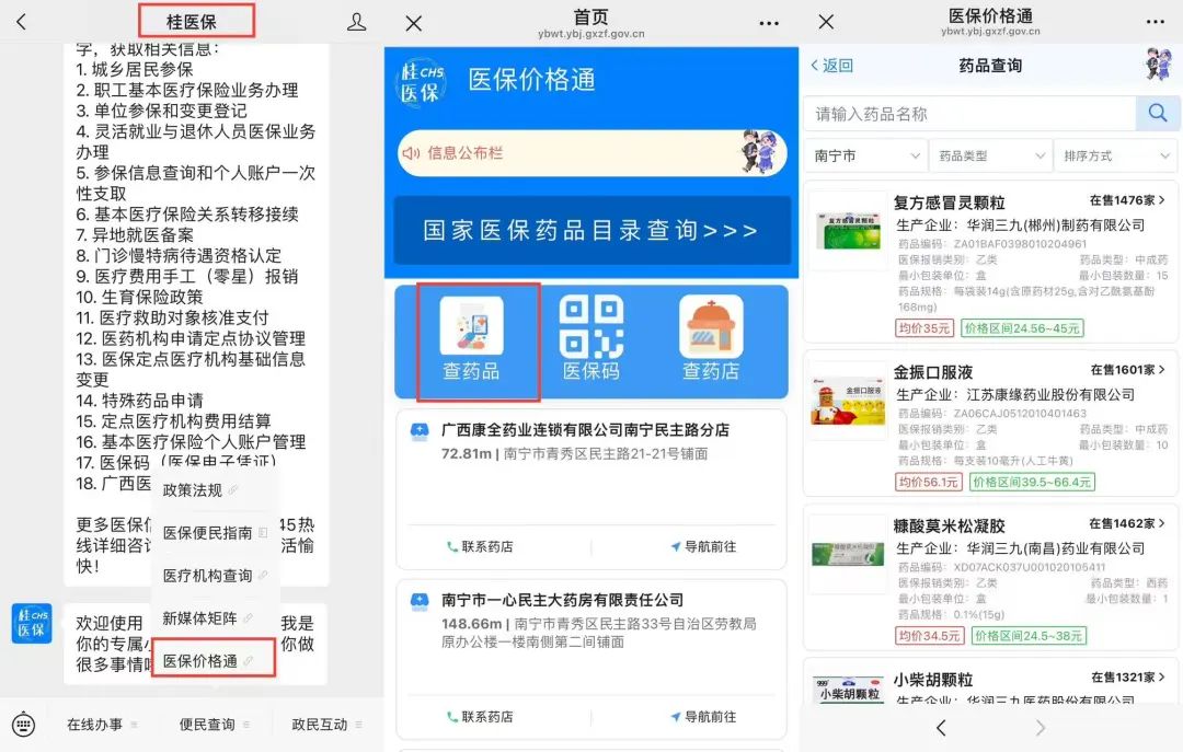 用户可以通过当地医保局App、微信小程序、微信公众号、支付宝小程序等途径进入,无需注册,即点即用。输入药品名称后,点击查看附近在售药店,不仅能看到药品代码、规格剂型、生产企业、批准文号等群众关注内容,还可以按照距离远近、价格高低进行排序筛选。