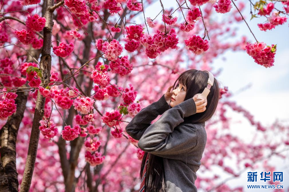 3月14日,一名女子在云南昆明圆通山公园的樱花树下留影。新华社记者 胡超 摄
