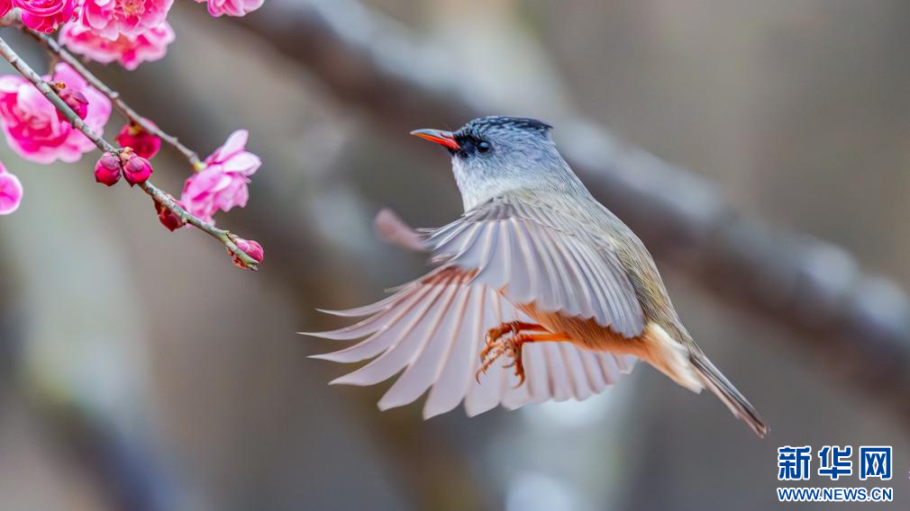 2月17日,在重庆市南川区大观镇,鸟儿在梅花间飞舞。新华社发(瞿明斌 摄)
